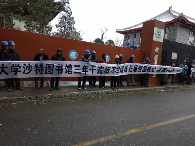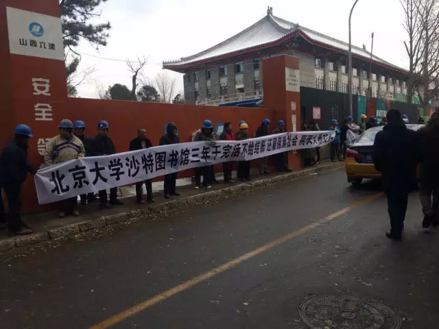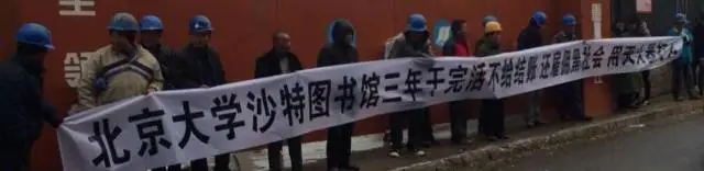 快讯:本日上午,正在建设中的北京大学沙特图书馆门前,出现了一些工人拉横幅的场景。工人头戴安全帽,白色横幅上写有“北京大学沙特图书馆三年干完活不给结账,还雇佣黑社会,用灭火器打人”等标语。