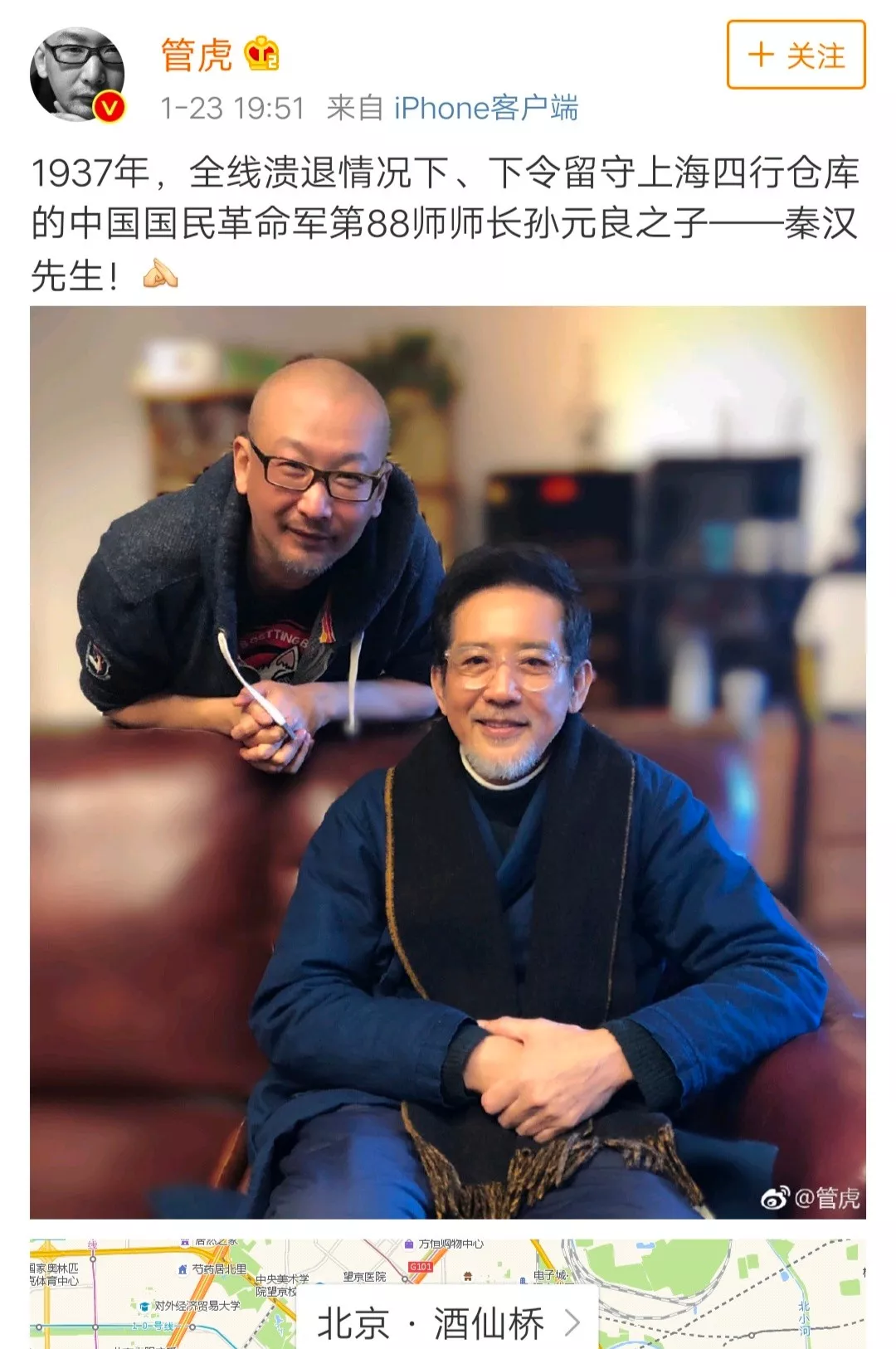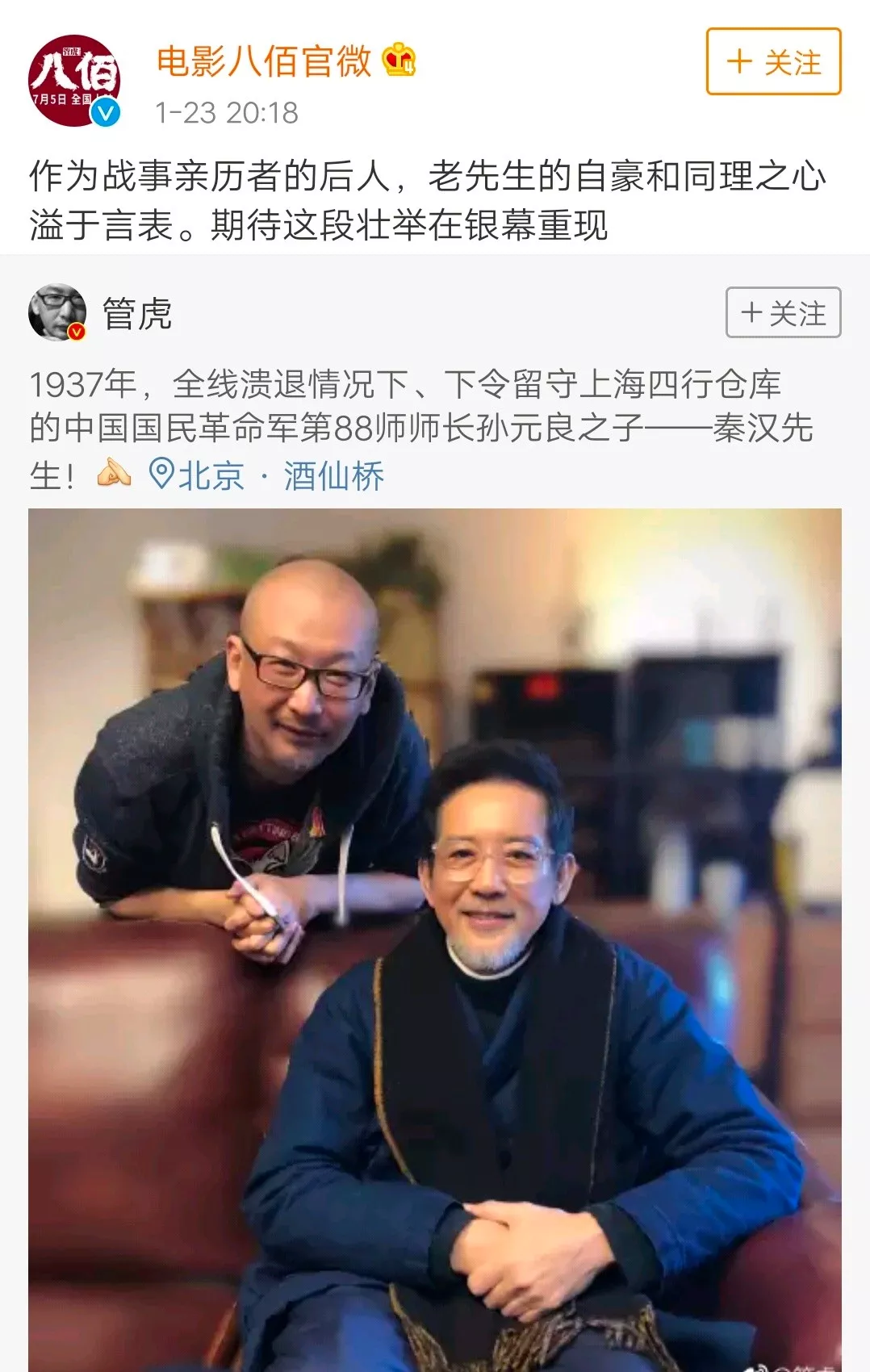 导演管虎发了一条微博:1937年,全线溃退情况下、下令留守上海四行仓库的中国国民革命军第88师师长孙元良之子——秦汉先生!